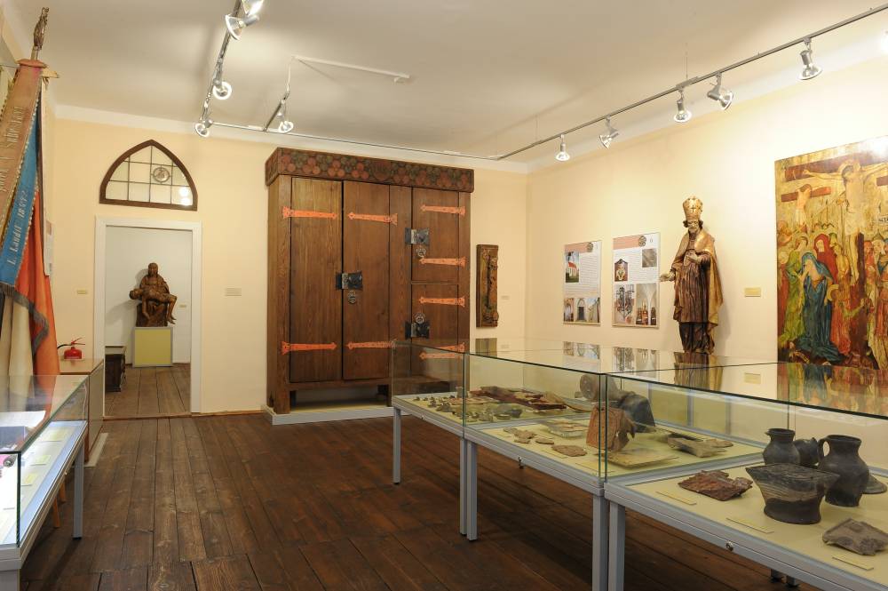 Mezi exponáty dominuje unikátní gotická skříň (městská pokladnice) snesená v roce 2013 z věže při kostelu sv. Petra a Pavla a po restaurování osazená původními dekorativními prvky z muzejních sbírek. Dalšími skvosty umělecko-historicky zaměřené expozice jsou gotické i raně barokní obrazy a plastiky ze soběslavských kostelů založených rožmberskými vladaři a z kostela sv. Marka. Ten nechal postavit místní primas Zachariáš Marek Markovský až po smrti Petra Voka, přesto však s rožmberskými symboly.