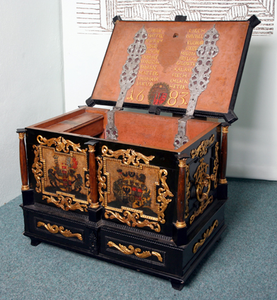 Expozice Cechy a řemesla představuje cechovní truhlice, konvice, ferule či vývěsní štíty a výrobky, které dokládají, že Jindřichův Hradec patřil v 16. - 17. století k největším českým městům s rozvinutým obchodem i řemesly.