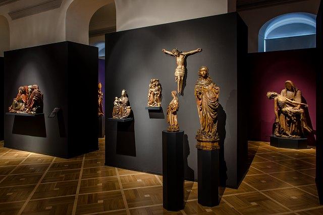 Jen o něco mladší je trojice soch představující trůnící Madonu mezi sv. Janem Křtitelem a sv. Janem Evangelistou z 60. let 14. století, pocházející ze špičkové pražské dílny. Třetím vrcholem sbírky je pozdně gotický oltář ze Seebergu (1520) s Pannou Marií a čtveřicí světců v původní gotické oltářní skříni, patřící k nejlepším pracím pozdně gotického umění u nás. Charakteristický styl opakující se i u několika dalších soch dokládá, že už šlo o dílnu, která měla své sídlo v Chebu.