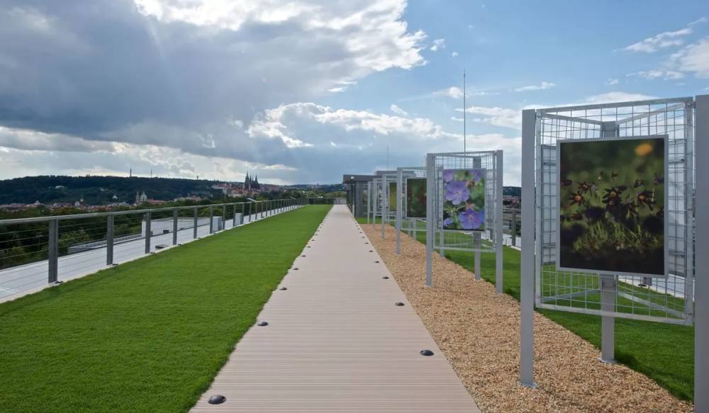 Střešní zahrada pražského Národního zemědělského muzea představuje zcela unikátní koncept. Expozice Živá zahrada výhledů nabízí včelí úly, políčko se zemědělskými plodinami, trávník k posezení. A také nezapomenutelný výhled na Prahu.